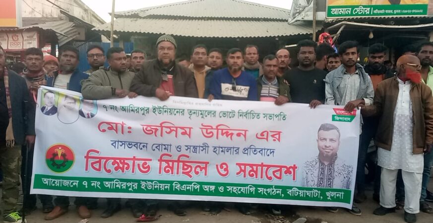 বটিয়াঘাটা প্রতিনিধি বটিয়াঘাটার ৭নং আমিরপুর ইউনিয়ন বিএনপির সভাপতি মো: জসিম উদ্দিন এর বাসভবনে বোমা ও সন্ত্রাসী হামলার প্রতিবাদে গতকাল রবিবার বিকাল ৪টায় মিছিলটি বটিয়াঘাটা বাজারের প্রধান প্রধান সড়ক প্রদক্ষিণ শেষে উপজেলা বিএনপি কার্যালয়ের সামনে এক বিক্ষোভ সমাবেশ অনুষ্ঠিত হয়। বিক্ষোভ মিছিল ও সমাবেশে উপস্থিত ছিলেন ৭নং ইউনিয়ন বিএনপির সাধারন সম্পাদক আসাদ মোল্লা, অমিও পাল, হাসানুর […]