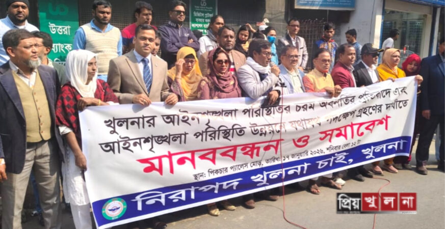 খুলনার আইন শৃঙ্খলা পরিস্থিতির চরম অবনতির প্রতিবাদে এবং আইন শৃঙ্খলা পরিস্থিতি উন্নয়নে যথাযথ পদক্ষেপ গ্রহণের দাবীতে নিরাপদ খুলনা চাই এর উদ্যোগে মানববন্ধন ও সমাবেশ আজ শনিবার দুপুর ১২ টায় নগরীর পিকচার প্যালেস মোড়ে অনুষ্ঠিত হয়। সংগঠনের সভাপতি সরদার বাদশা’র সভাপতিত্বে অনুষ্ঠিত মানববন্ধন ও সমাবেশ পরিচালনা করেন সংগঠনের উপদেষ্ঠা মানবাধিকার সংগঠক এস এম দেলোয়ার হোসেন এর […]